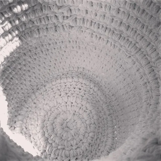 Unlike knitting, done with two needles, crochet is a solitary craft: a single artist, a single hook, a single knot, one by one, over and over, following the vision and rhythm of the pattern maker—a solitary artist and her tool. During the project, there are moments she will stop, look at the object she’s woven and count up the rows as they circle around the basket, rug or child’s toy. As she counts, she compares her progress to the pattern of completion she holds in her mind’s eye. If something is awry, with the tug of the string, each knot loosens as if nothing were ever holding it in place and in a moment, the object is gone, and only a single thread of yarn remains.